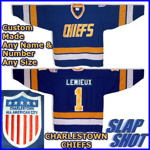 This listing is for a CHARLESTOWN CHIEFS Blue Away #1 Denis LEMIEUX jersey complete with the number 1 and the name LEMIEUX on the back. But we will be happy to make with any name and number you would like, please just send your request with the order. Shipping is the same flat rate anywhere in the world. Authentic style NHL premium quality jersey All STITCHED / EMBROIDERED, no screen printing or iron ons. Please allow 7 days for production of this jersey plus shipping transit time.
