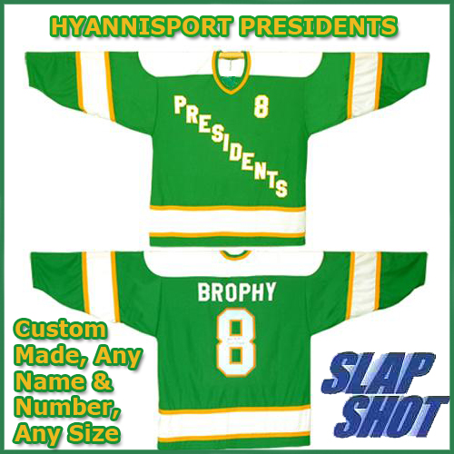 Here is your chance to own your favorite player and team jersey from the movie SlapShot. This HYANNISPORT PRESIDENTS Green Road jersey is great with the correct logos and patches. These jerseys are Authentic NHL style game jerseys and are superbly crafted and custom made, using only the finest materials. Two-way stretch fabric, embroidered twill team chest crest and shoulder patches, the tackle twill lettering and numbers sewn on to the jersey make these the one to buy.