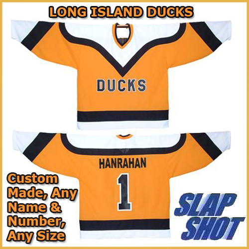 Here is your chance to own your favorite player and team jersey from the movie SlapShot. This LONG ISLAND DUCKS Orange Road jersey is great with the correct logos and patches. These jerseys are Authentic NHL style game jerseys and are superbly crafted and custom made, using only the finest materials. Two-way stretch fabric, embroidered twill team chest crest and shoulder patches, the tackle twill lettering and numbers sewn on to the jersey make these the one to buy.